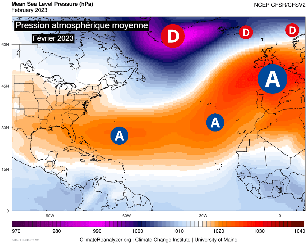 Pression atmosphérique moyenne durant le mois de février 2023 entre l'Atlantique et l'Europe – Climate Reanlyzer