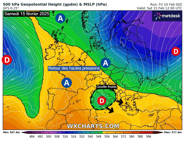 Situation atmosphérique attendue pour ce samedi 15 février 2025 – Modèle GFS via WX CHARTS