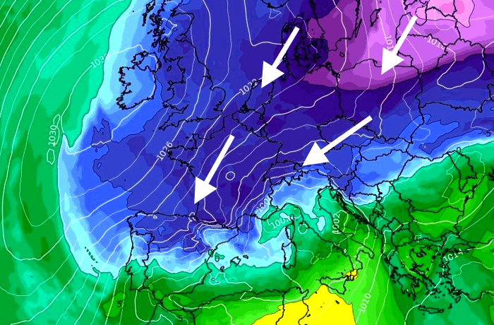 Au cours de la semaine prochaine, une dorsale anticyclonique devrait s'ériger sur le nord de l'Atlantique. Cela aura pour effet de permettre le décrochage d'une dépression scandinave. Celle-ci devrait gagner l'Europe Centrale puis plonger vers la Méditerranée. Selon le scénario du modèle américain, cette dépression se creuserait en Méditerranée et apporterait un flux de nord-est soutenu et vecteur de froid sur la France. Selon le modèle allemand, cette dépression serait moins active et le flux de nord-est serait plus mou avec des températures simplement très fraîches. Enfin, le modèle européen envisage plutôt le décalage de cette dépression au dessus du golfe de Gascogne, ce qui ne dirigerait pas vraiment le froid vers notre pays.