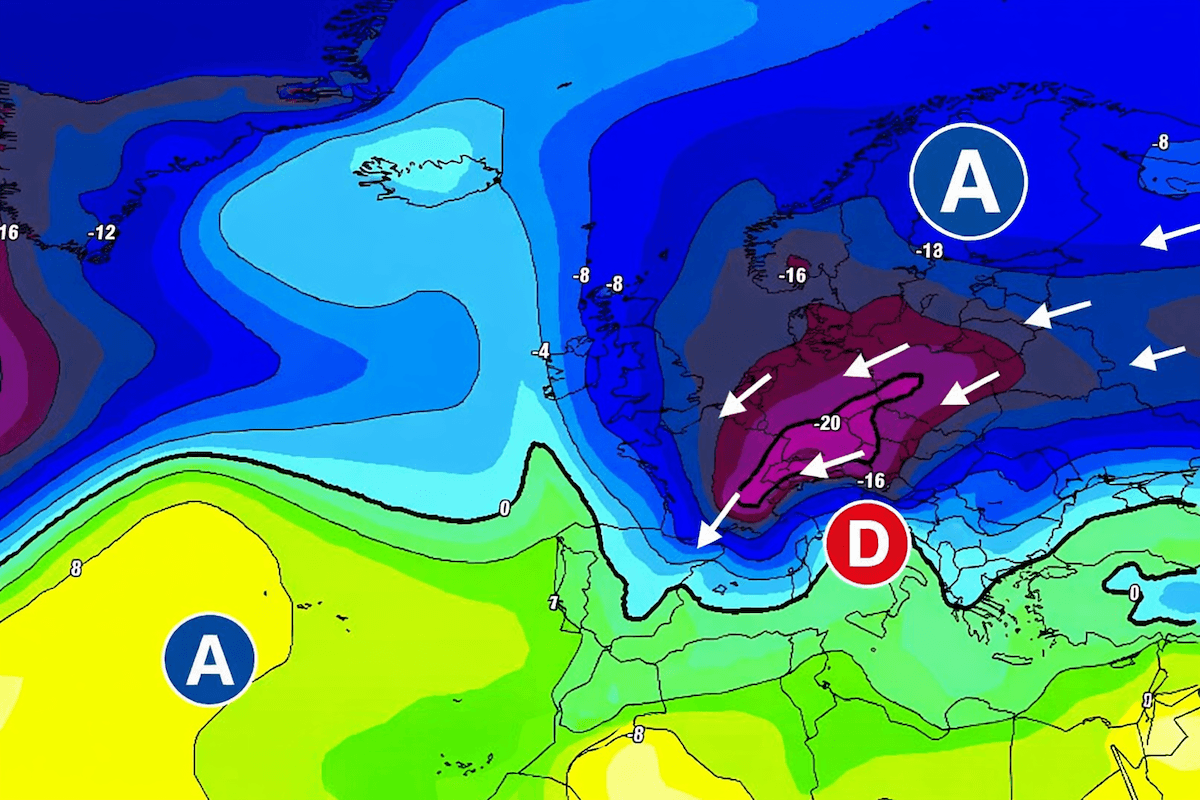 Température de la masse d'air vers 1500m le 13 février 1929 - réanalyse via meteociel.fr