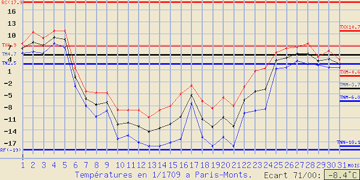 Janvier 1709 est également cité pour son froid polaire. Médecin français, Louis Morin de Saint-Victor réalise des relevés de température à Paris. Ainsi, on sait que la capitale est frappée par un froid glacial du 6 au 23 janvier 1709 ! Les températures minimales chutent entre -10 et -18°C et les maximales plafonnent entre -5 et -10°C, des niveaux impensables aujourd'hui ! L'écart mensuel aux normales 1971-2000 serait de -8,4°C ! Ce froid glacial concerne aussi le sud du pays. La plupart des fleuves français gèlent, comme la Garonne que l'on traverse à cheval selon les récits d'époque !