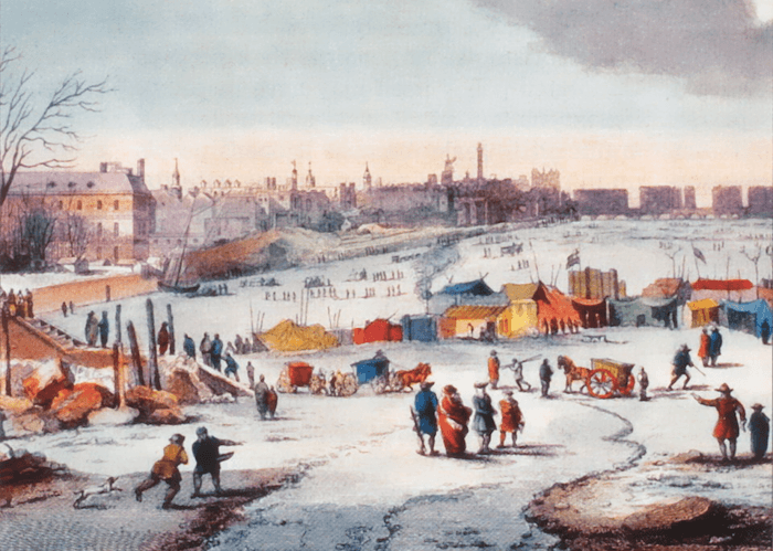 Parmi les hivers les plus froids du "petit âge glaciaire", l'hiver 1683-1684 est souvent qualifié de "grand gel en Europe". Certains historiens le décrivent comme l'hiver le plus sévère du millénaire. S'il n'y a pas de relevés de température, on sait qu'un froid glacial s'abat sur toute l'Europe du Nord, l'Angleterre, la Belgique, la France et la Suisse entre la fin décembre 1683 et février 1684. Les récits parlent de 56 jours de gel consécutifs à Paris ! À Londres, la Tamise gèle pendant deux mois et la glace atteint 28 centimètres d'épaisseur ! Le Lac Léman se fige aussi dans la glace pendant 18 jours !