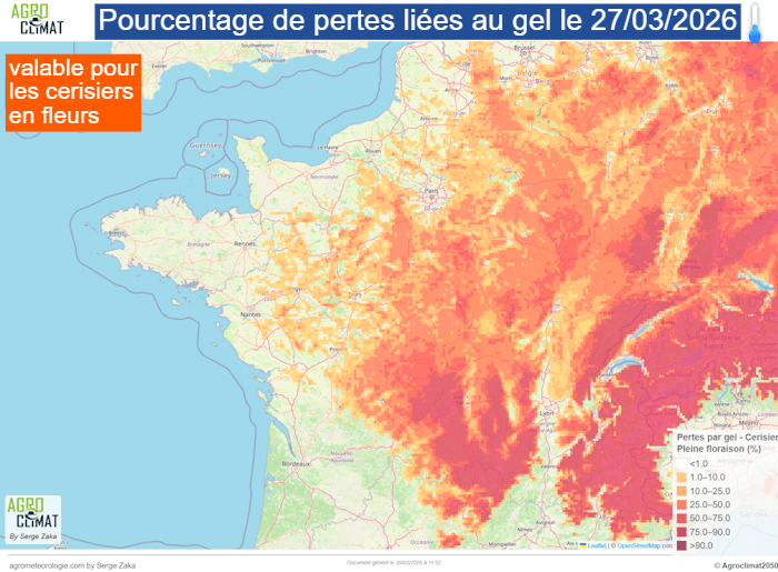 Estimation du pourcentage de pertes suite au gel du vendredi 27 mars 2026 pour les cerisiers en fleurs - Agro-Climat via Serge Zaka
