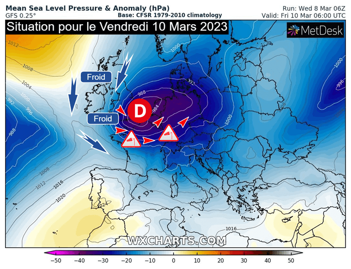 Dans ce contexte perturbé, les derniers scénarios envisagent le creusement d'une dépression pour la journée du vendredi 10 mars 2023. Celle-ci devrait transiter vers la Manche avant de se décaler vers le Benelux. Au sud du cœur dépressionnaire, boosté par un fort courant jet en altitude, on redoute un fort coup de vent voire une tempête sur les régions de la moitié nord de la France, où le gradient de pression s'annonce resserré. La menace de vents violents apparaîtra dès la nuit du jeudi 9 au vendredi 10 mars, se prolongeant en cours de journée.