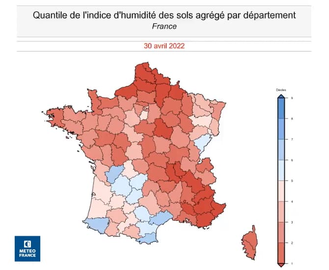 On note cependant des disparités régionales assez nettes. Ainsi, le quart sud-ouest est le mieux loti en terme d'humidité superficielle des sols en date du 30 avril 2022. Certains départements comme les Pyrénées-Atlantiques, les Pyrénées-Orientales ou l'Hérault enregistrent une humidité de surface excédentaire. En revanche, les régions du nord, du nord-ouest, du centre et du sud-est de la France constatent une sécheresse superficielle marquée pour la saison.