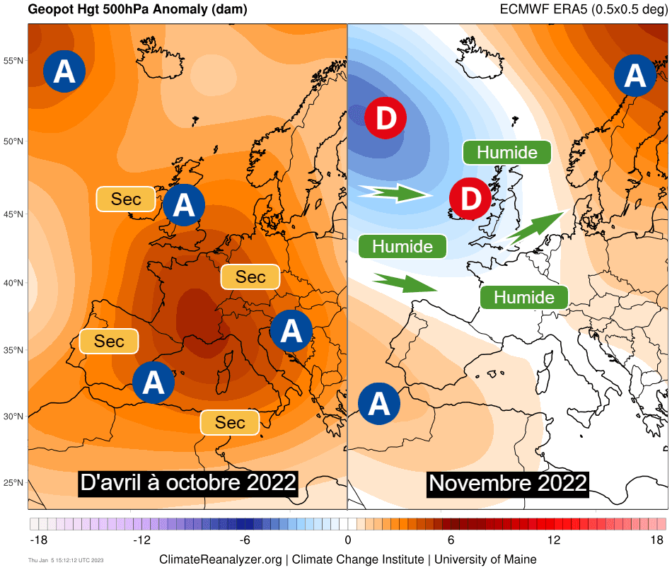 Anomalie de géopotentiels d'avril à octobre 2022 et en novembre 2022 - carte climatereanalyser.org