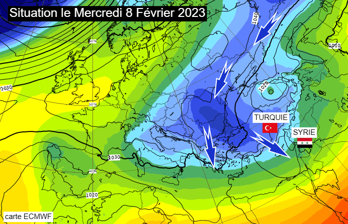 Pour ne rien arranger, la Turquie est actuellement en plein épisode hivernal. Ce dernier est généré par une coulée d'air froid venu de Russie et qui s'étend à l'ensemble des pays des Balkans, à la Mer Noire et à l'ensemble de la Turquie. L'air froid déborde jusque sur le nord de la Syrie. Ces coulées d'air froid continental n'ont rien d'exceptionnel et caractérisent l'hiver turc. Cependant, il faut admettre que celle-ci intervient vraiment au plus mauvais des moments.