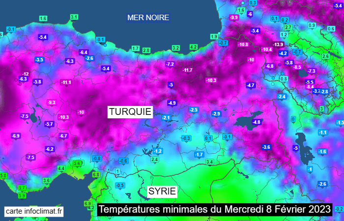 Températures minimales du jeudi 9 février 2023 en Turquie - via infoclimat.fr