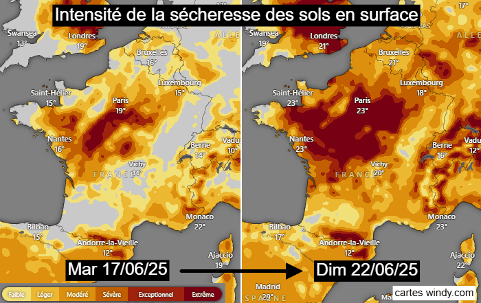 Intensité de la sécheresse des sols en surface le mardi 17 et le dimanche 22 juin 2025 - windy.com