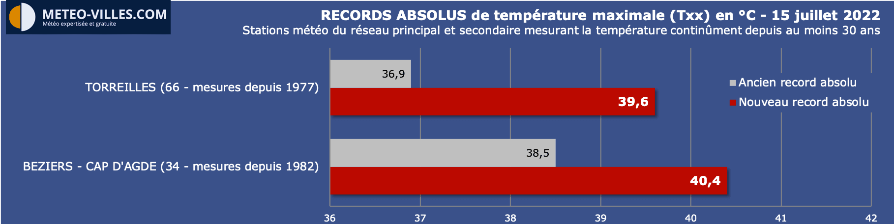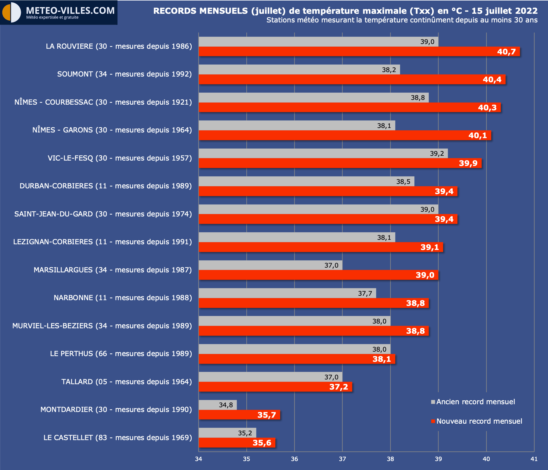 Face à de telles températures, ce sont de nouveaux records pour un mois de juillet qui ont été battus durant l'après-midi. Pour certaines villes de l'Hérault ou de l'Aude, l'ancien record mensuel a été battu pour la 2e fois voire même la 3e fois en quelques jours (Soumont, Arquettes-en-Val, Caunes-Minervois...).