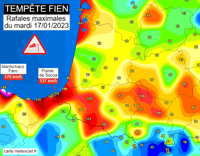 Rafales maximales de la tempête Fien le mardi 17 janvier 2023 - carte meteociel.fr
