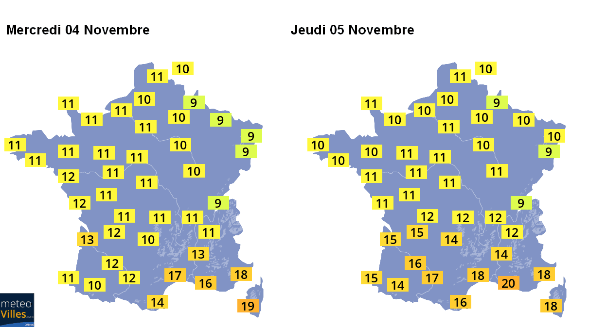 Températures maximales prévues en France entre le Mercredi 04 novembre et le Jeudi 05 Novembre - Météo-Villes