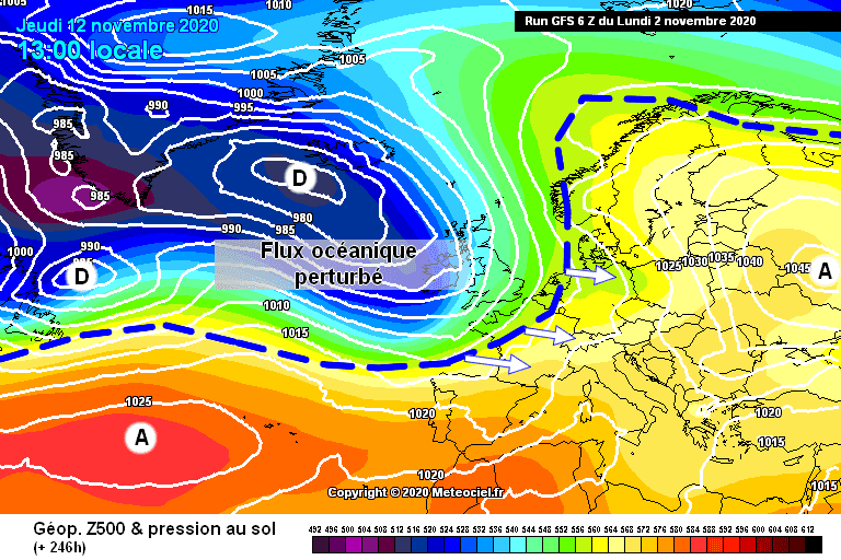 Schéma de la situation atmosphérique sur l'Ouest de l'Europe pour la journée du 12 Novembre - Modèle GFS via météociel.fr