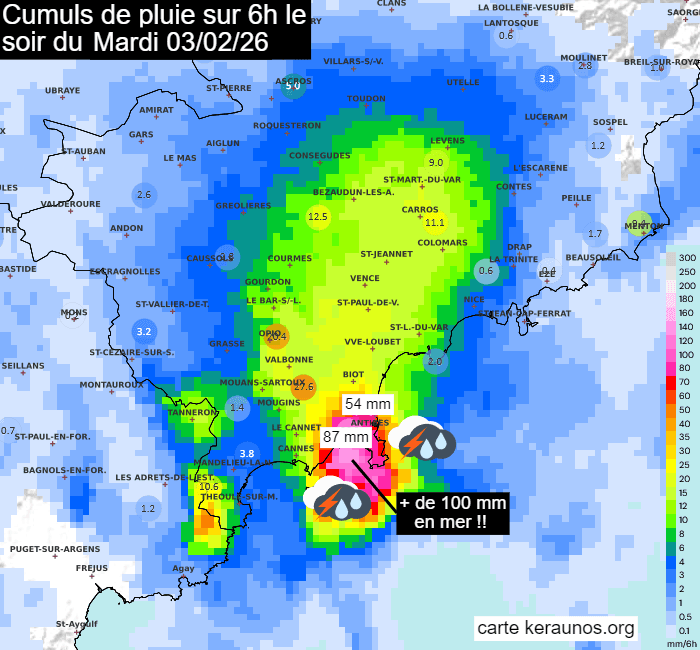 Cumuls de précipitations sur les Alpes-Maritimes en 6h le soir du mardi 3 février 2026 - keraunos.org