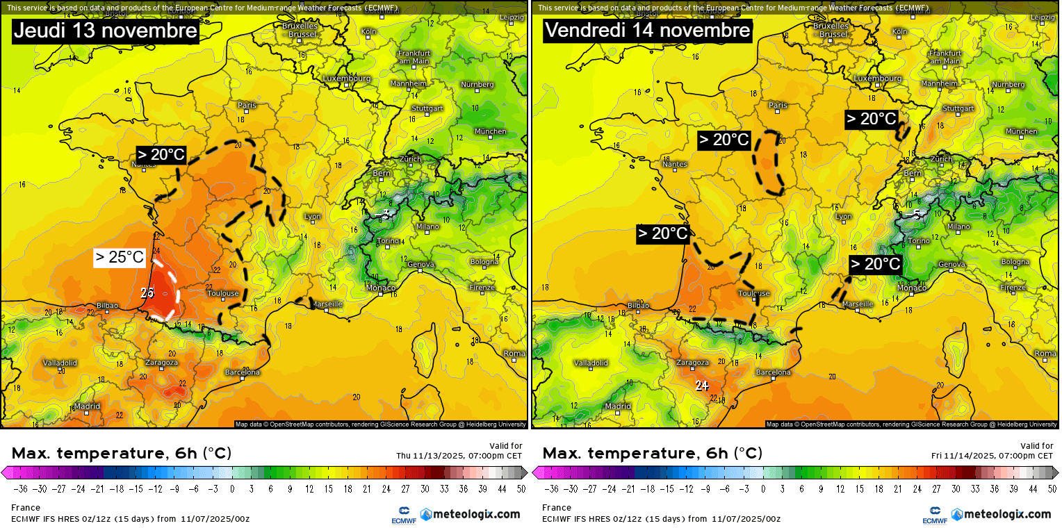 Températures maximales attendues pour le 13 et le 14 novembre 2025 – Meteologix