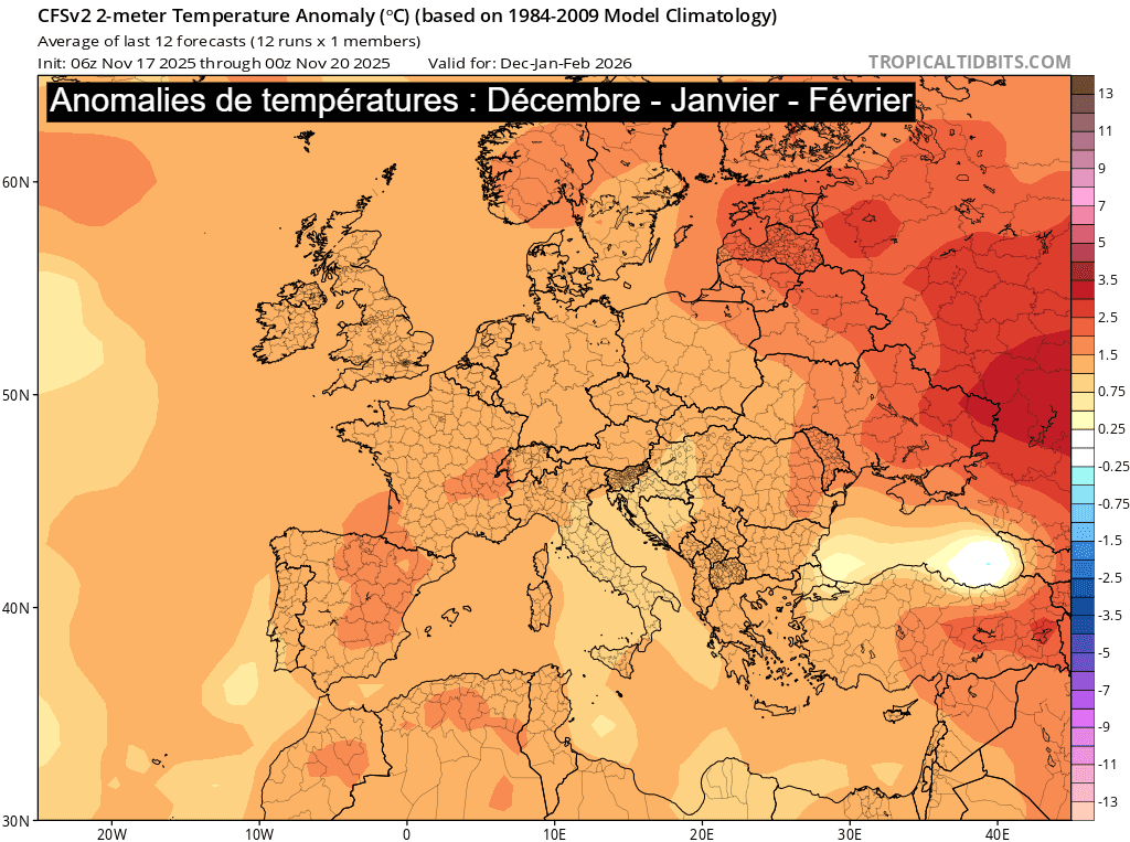 Selon le modèle américain CFS, la France et l'Europe devraient vivre un hiver 2025-2026 globalement plus doux que la normale. En France, l'anomalie de température devrait se situer entre +0,7 et +0,9°C sur la période décembre-janvier-février, ce qui équivaut à un hiver plus doux que la normale certes, mais loin des hivers exceptionnels comme l'hiver 2019-2020 (+2,7°C d'anomalie thermique) ou encore l'hiver 2023-2023 (+2°C). Celui-ci serait néanmoins plus doux que l'hiver 2024-2026 selon ce scénario, qui avait observé une anomalie de températures de +0,6°C à l'échelle de la France.