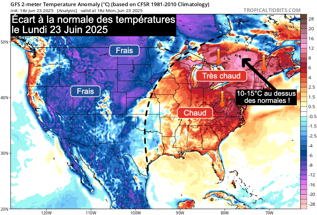 Le nord de l'Amérique est actuellement coupé en deux. Une imposante coulée d'air frais concerne toute la partie ouest des États-Unis où les températures sont souvent 5 à 8°C voire 10°C en dessous des normales de saison ! Par effet de vases communicants, cette coulée d'air frais génère une pulsion chaude à l'avant, qui remonte sur les États de l'est et jusqu'au Québec, où les températures sont 10 à 15°C au dessus des normales !