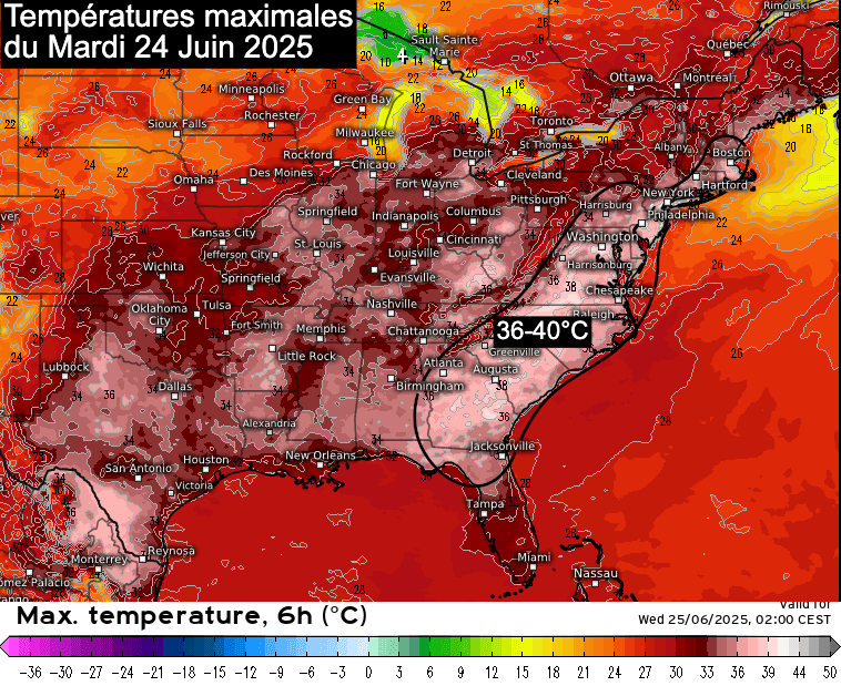 Températures maximales du mardi 24 juin 2025 dans l'est des USA - meteologix.com