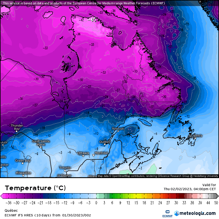 Températures minimales attendues pour le samedi 4 février 2022 sur l'Est du Canada - ECMWF IFS HRES via meteologix