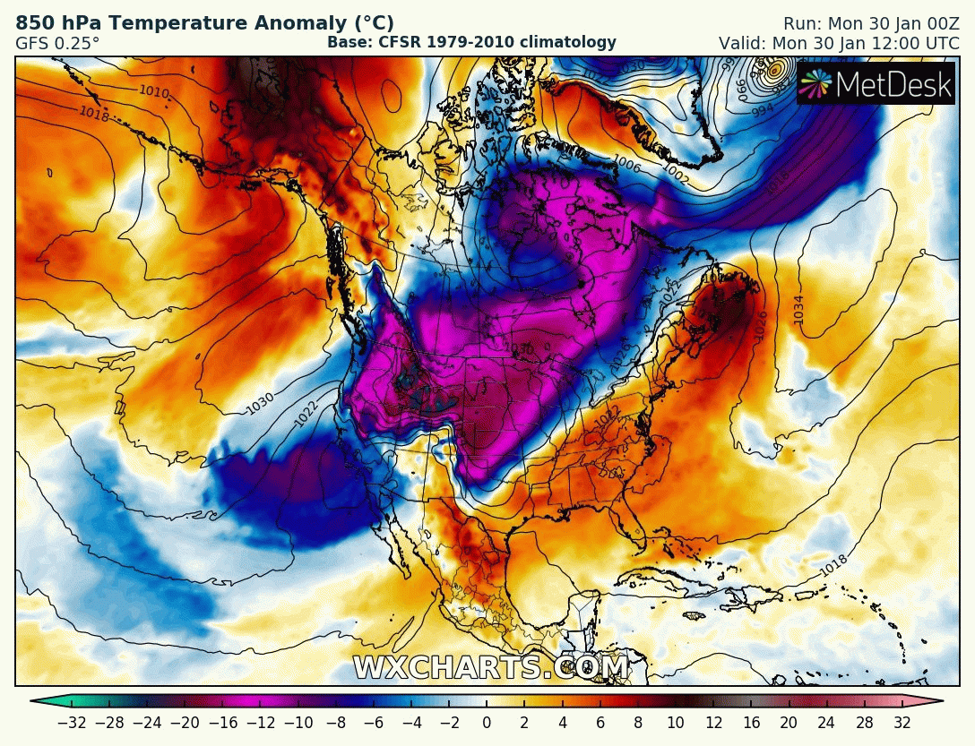Evolution des anomalies de températures à 850 hPa sur l'Amérique du Nord entre le 30 janvier et le 6 février 2023 – Modèle GFS via WX CHARTS