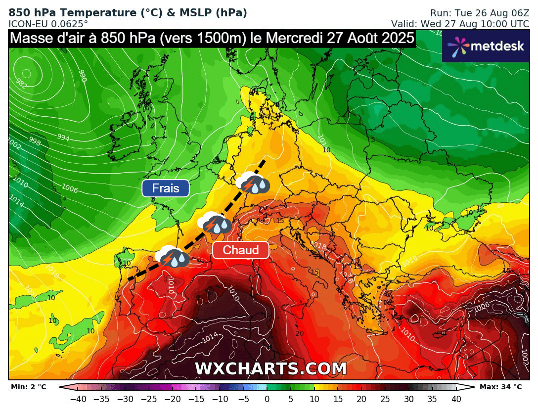 Masse d'air à 850 hPa (vers 1500m) le mercredi 27 août 2025 - wxcharts.com