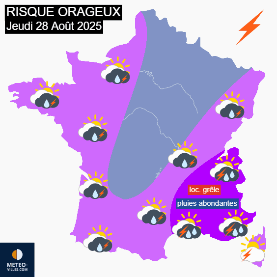 Carte du risque orageux pour le jeudi 28 août 2025 - Météo Villes