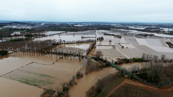 Crue majeure de l'Hérault vue depuis Bessan (34) ce lundi 22 décembre 2025 - mairie