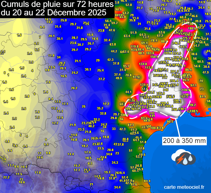 Entre ce week-end des 20 et 21 décembre et la journée du lundi 22 décembre 2025, les précipitations ont été très abondantes sur le Languedoc et les Cévennes. En l'espace de 72 heures, il est tombé généralement entre 200 et 350 mm sur le massif cévenol ! On relève jusqu'à 345 mm à Gorniès et 336 mm à Saint-Maurice-Navacelle dans l'Hérault. La plaine n'a pas été épargnée, loin de là. La station de Montpellier totalise 141 mm et on relève même 258 mm à Saint-Jean-de-Védas !
