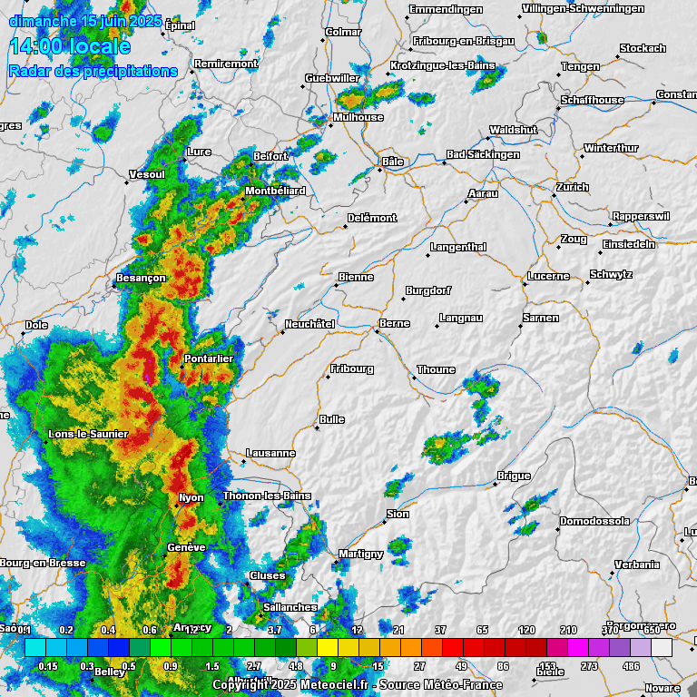 Animation radar sur la Suisse entre 14h et 16h ce dimanche 15 juin 2025 – Via meteociel.fr
