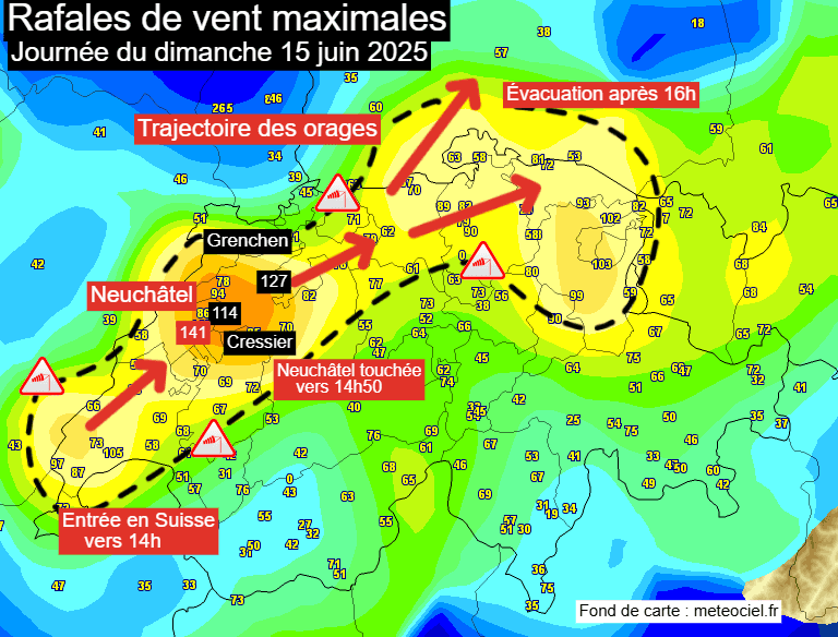 La station de Neuchâtel, située en plein sur la trajectoire de cet orage, a pu relever une rafale à 141km/h. Non loin de là, ce sont également 114km/h qui ont pu être relevés à Cressier puis 127km/h à Grenchen un peu plus tardivement durant l'après-midi.