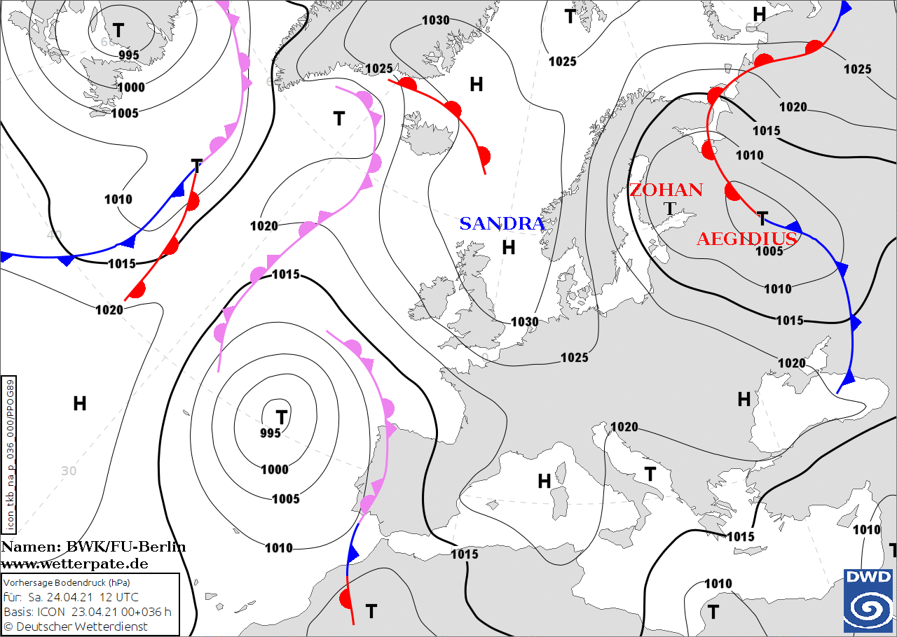 Noms des dépressions et anticyclones prévus pour samedi 24 avril 2021 à midi (Berlin)