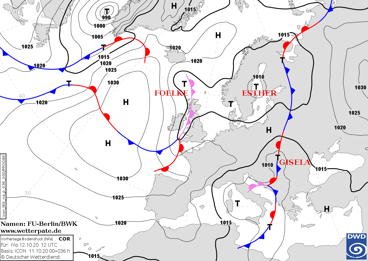 Noms des dépressions et anticyclones prévus pour lundi 12 octobre 2020 à midi (Berlin)